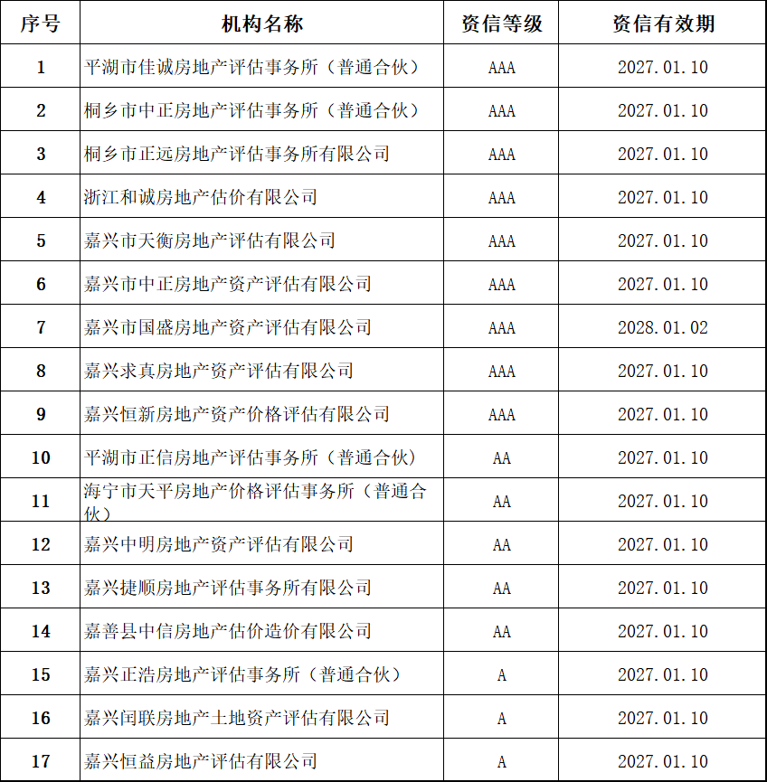 嘉兴地区机构资信等级结果